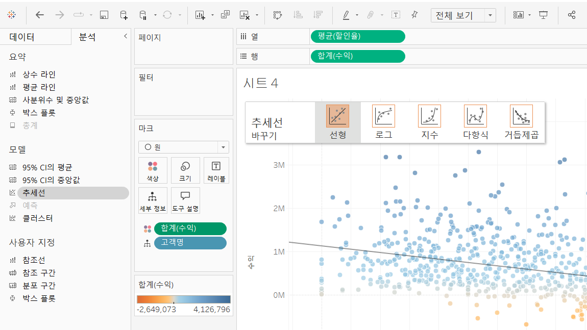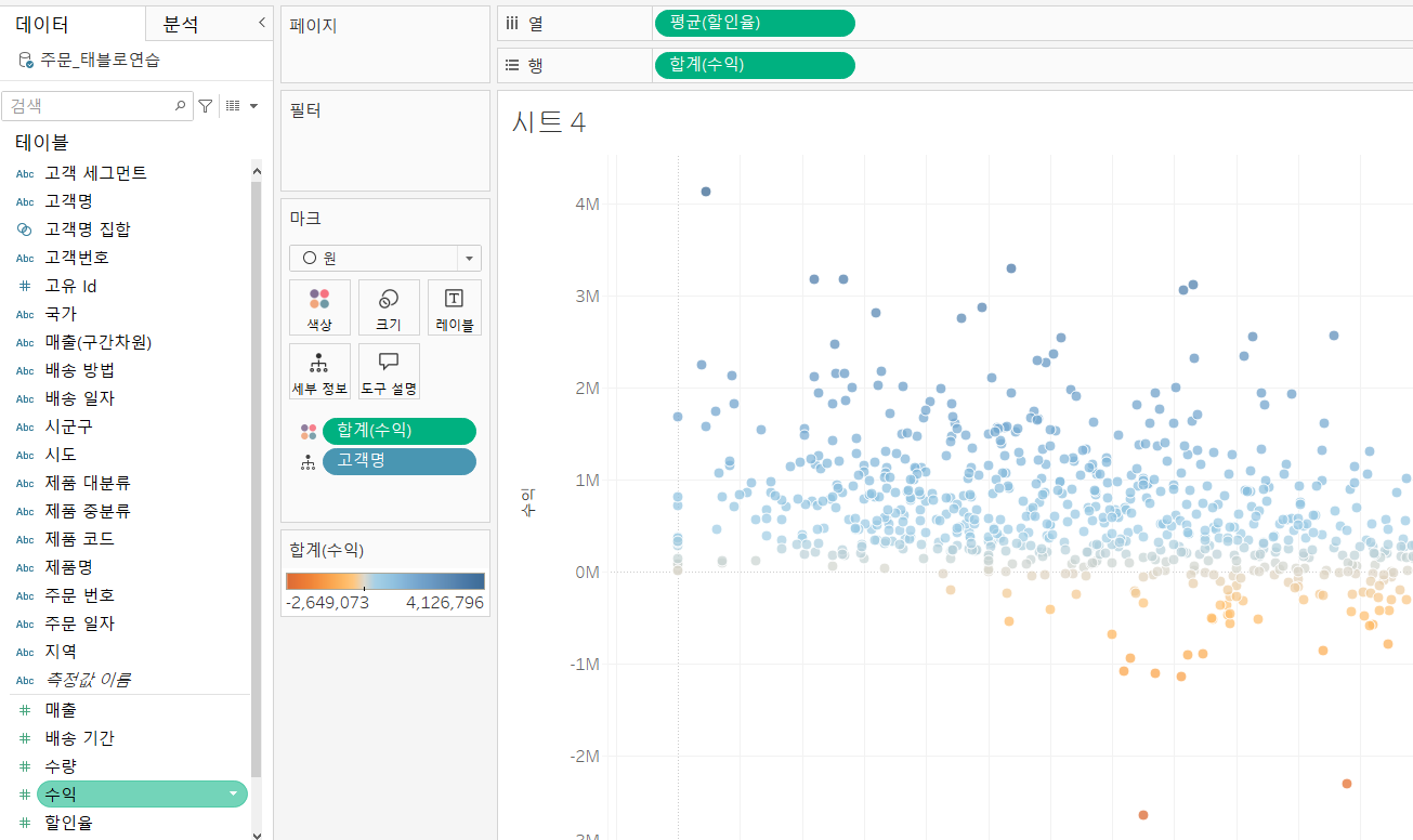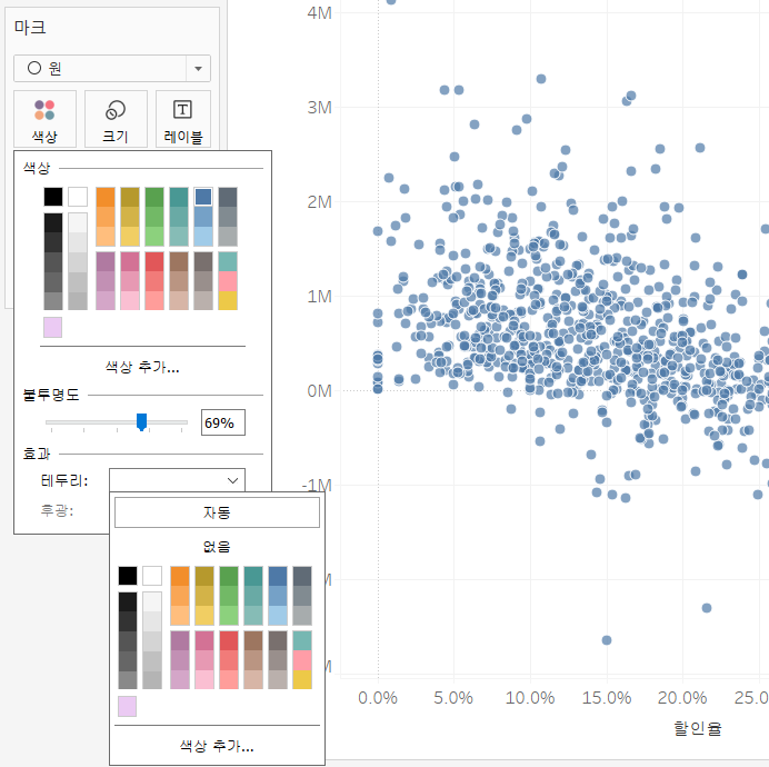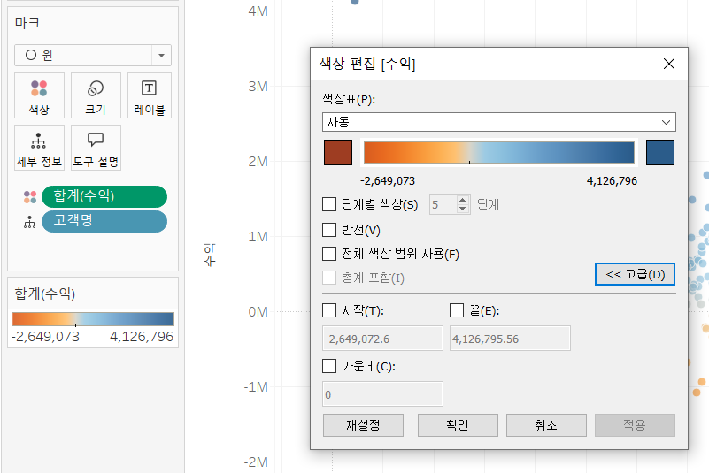 <사진2> 에서 좌측 하단에 [합계(수익)]을 더블클릭하면, 색상 편집이 뜹니다. 고급을 누르시면 가운데 필드에 기준 값인 0이 적혀있는 것을 확인할 수 있습니다. 이 값을 1000k (== 1m) 등을 입력하여 적용하면, 점의 색상이 이 값에 맞춰서 바뀌는 것을 확인할 수 있습니다 !