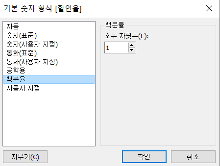 할인율 우클릭 -> 기본 속성 -> 숫자 형식 -> 백분율 -> 소수 자릿수를 1로 작성한 후, 확인을 눌러줍니다.