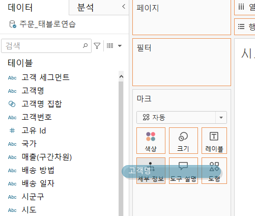 <사진 1> 고객명 필드를 '세부 정보' 위에 드래그 앤 드롭해줍니다.