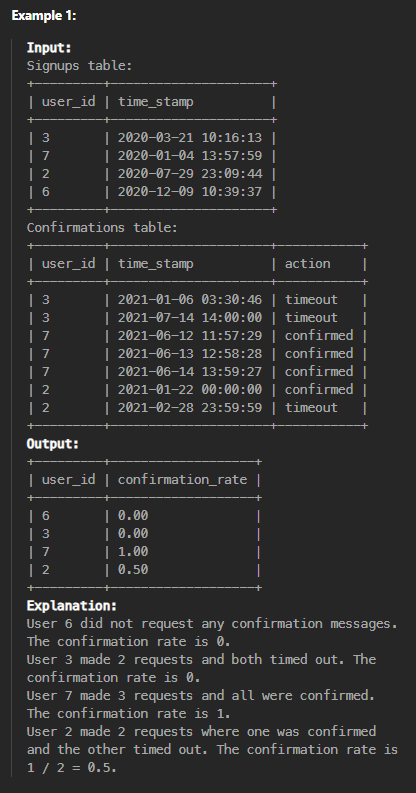 Each row of this table indicates that the user with ID user_id requested a confirmation message at time_stamp and that confirmation message was either confirmed ('confirmed') or expired without confirming ('timeout').