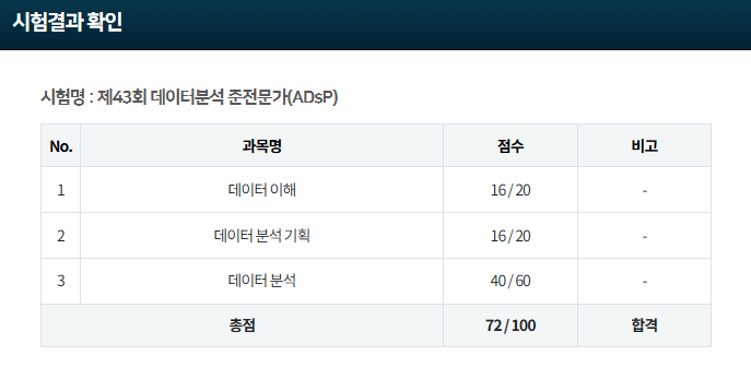 ro_rdil_31 2024. 11. 22. 17:12제43회 데이터분석 준전문가(ADsP) 에 합격하게 되었습니다 !